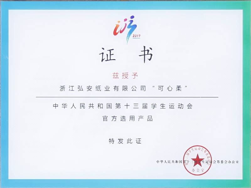 2017年9月4日中华人民共和国第十三届学生运动会在浙江杭州举行,可心柔携手中国邮政、中国平安、娃哈哈、京东校园、吉利汽车等知名企业品牌亮相大会。作为本次大会的12家合作单位之一,浙江收米体育·收米官方网站-收米体育(中国)纸业有限公司参加了发布会,并接受了官方选用产品的授牌。